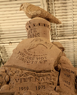 To leverage the fundraising efforts for the construction of the Veterans Memorial, Plainwell artist and resident, Charlie Wakefield created a 10-foot sand castle weighing in at 20,000 pounds that attracted spectators from near and far. The sculpture was housed temporarily inside the former Plainwell Paper Mill.